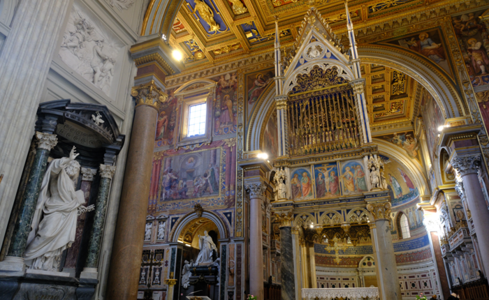 E ancora nell’abside ci attende il grande mosaico di Cristo circondato da santi e angeli, capolavoro del Duecento romano e il trono che accoglie il Papa come Vescovo di Roma.